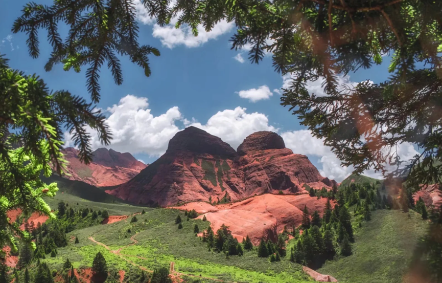 The exposed mountain rock area is large enough, and the mountain is spectacular enough, but there are also dense vegetation and meadows in some lower places in the ravine, so a unique plateau Danxia landform is formed.