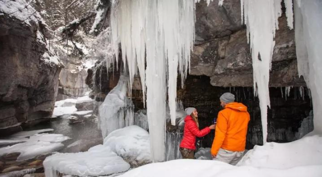 Of course, the magical Rocky Mountains not only have bubble lakes, but also have a unique charm in the frozen canyons in winter, which is definitely a good place to take photos. Maligne Canyon, located in Jasper National Park, is a typical karst landscape and is one of the most magnificent and narrowest canyons in Canada. In winter, the waterfall of Marlene Canyon is completely frozen, becoming the most natural ice and snow palace ever built by nature