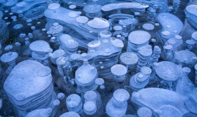 Let’s take a look at the bubble lake first. In fact, the cause of the bubble lake is actually very simple, that is, the organic matter at the bottom of the lake produces methane gas in the process of being decomposed by bacteria. In winter, because the lake surface is frozen, the decomposed methane gas is frozen under the lake surface. Generally speaking, artificial lakes are more likely to occur because these lakes used to inhabit many animals and plants, and these organics are more likely to release methane in the process of continuous decomposition