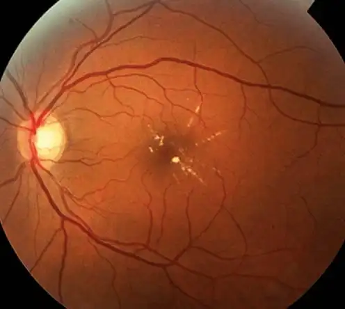 In the early stage of macular membrane, it is manifested as enhanced reflection on the surface of the retina, resembling a layer of glass paper; In the later stage of the macular membrane, it appears as a semi transparent or opaque gray white membrane, accompanied by macular folds, tortuous blood vessels, macular displacement, and retinal hemorrhage.
